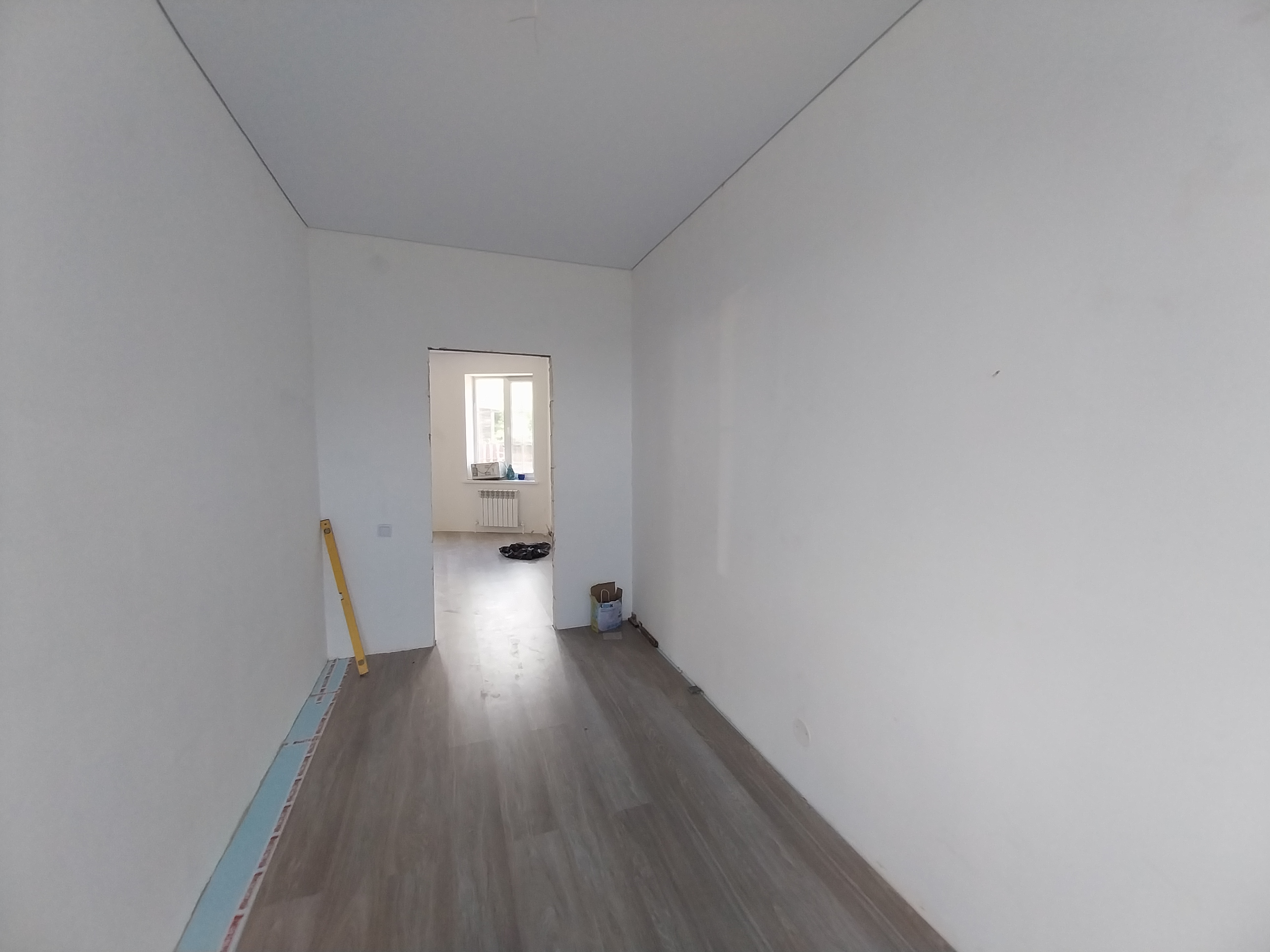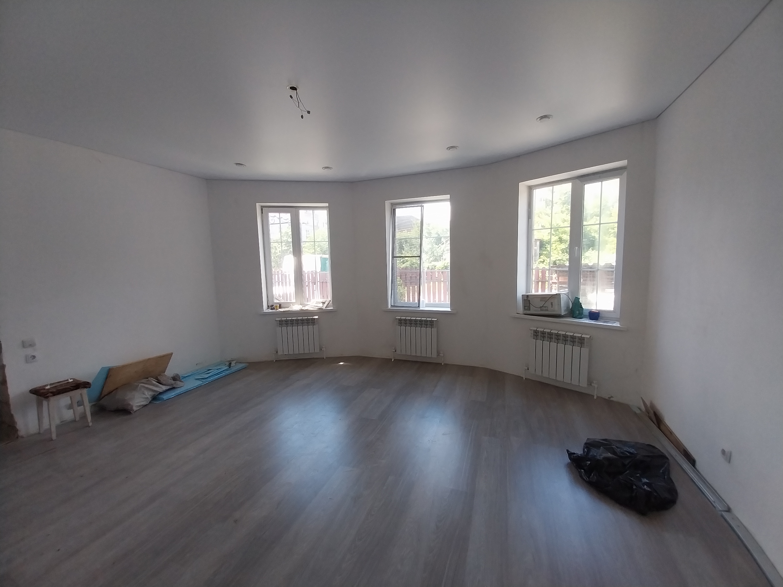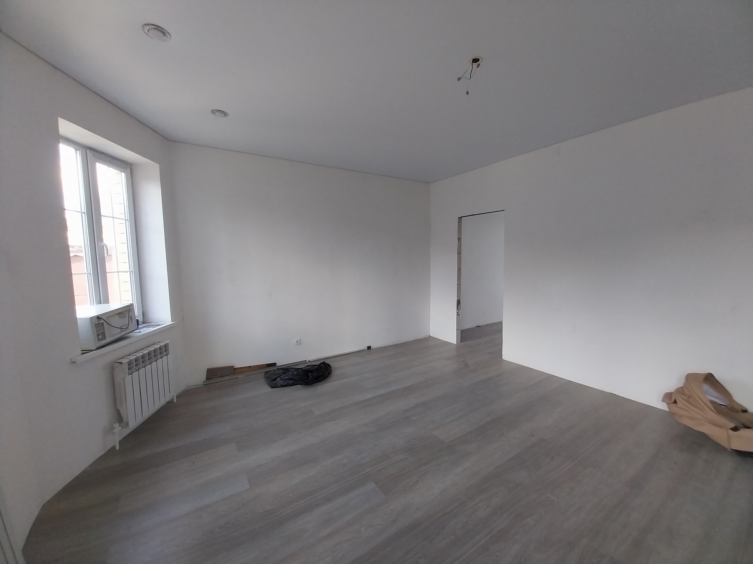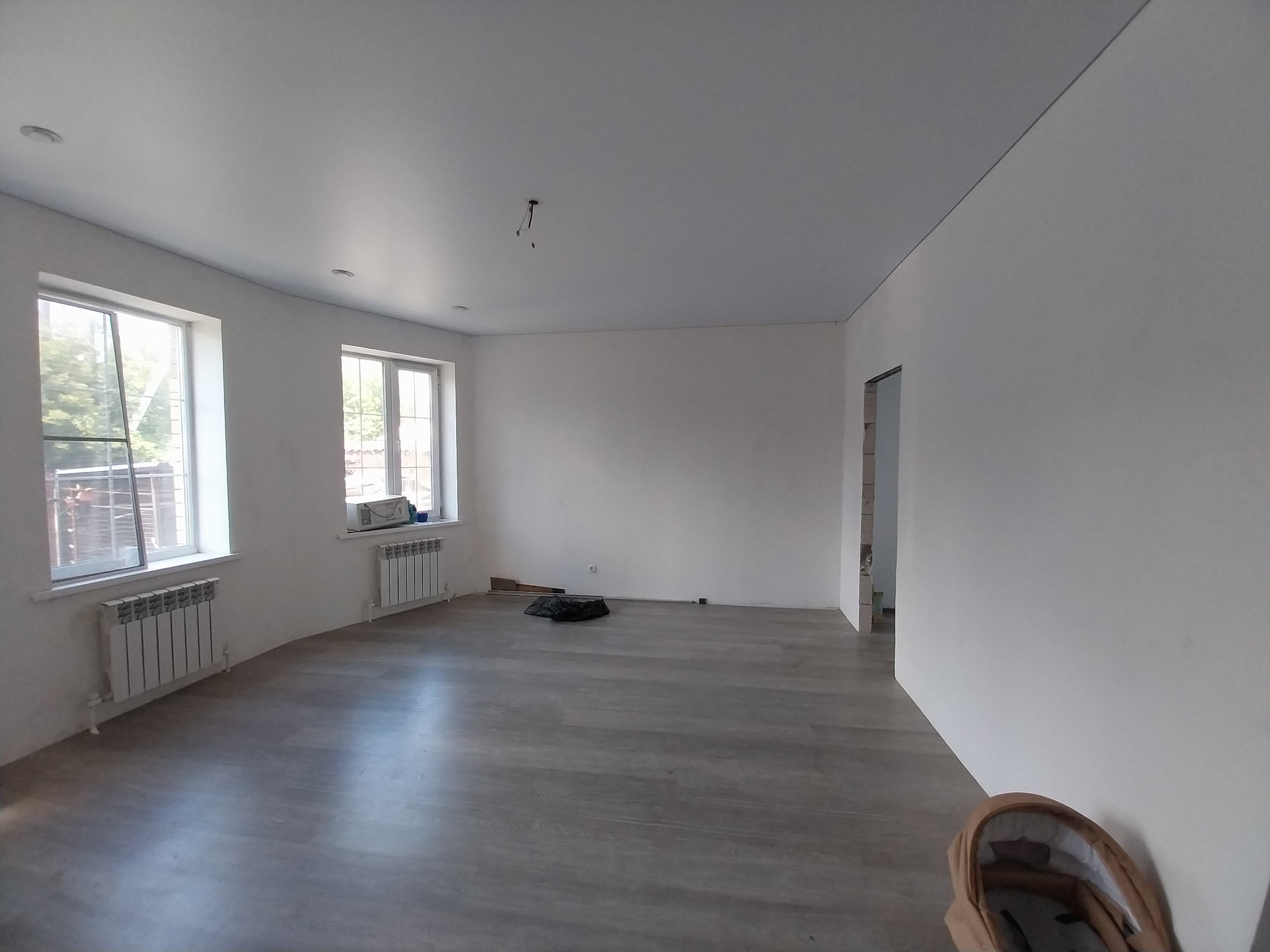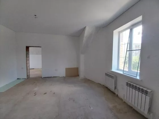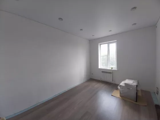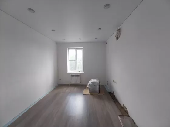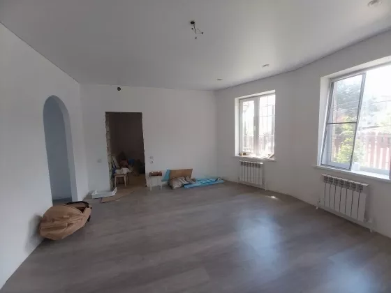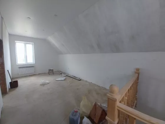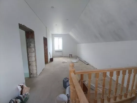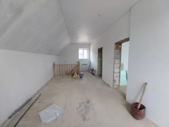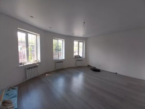 Дом готов к чистовой отделке. На первом этаже на полу ламинат, натяжные потолки во всем доме. Санузел совмещен, в кафеле.