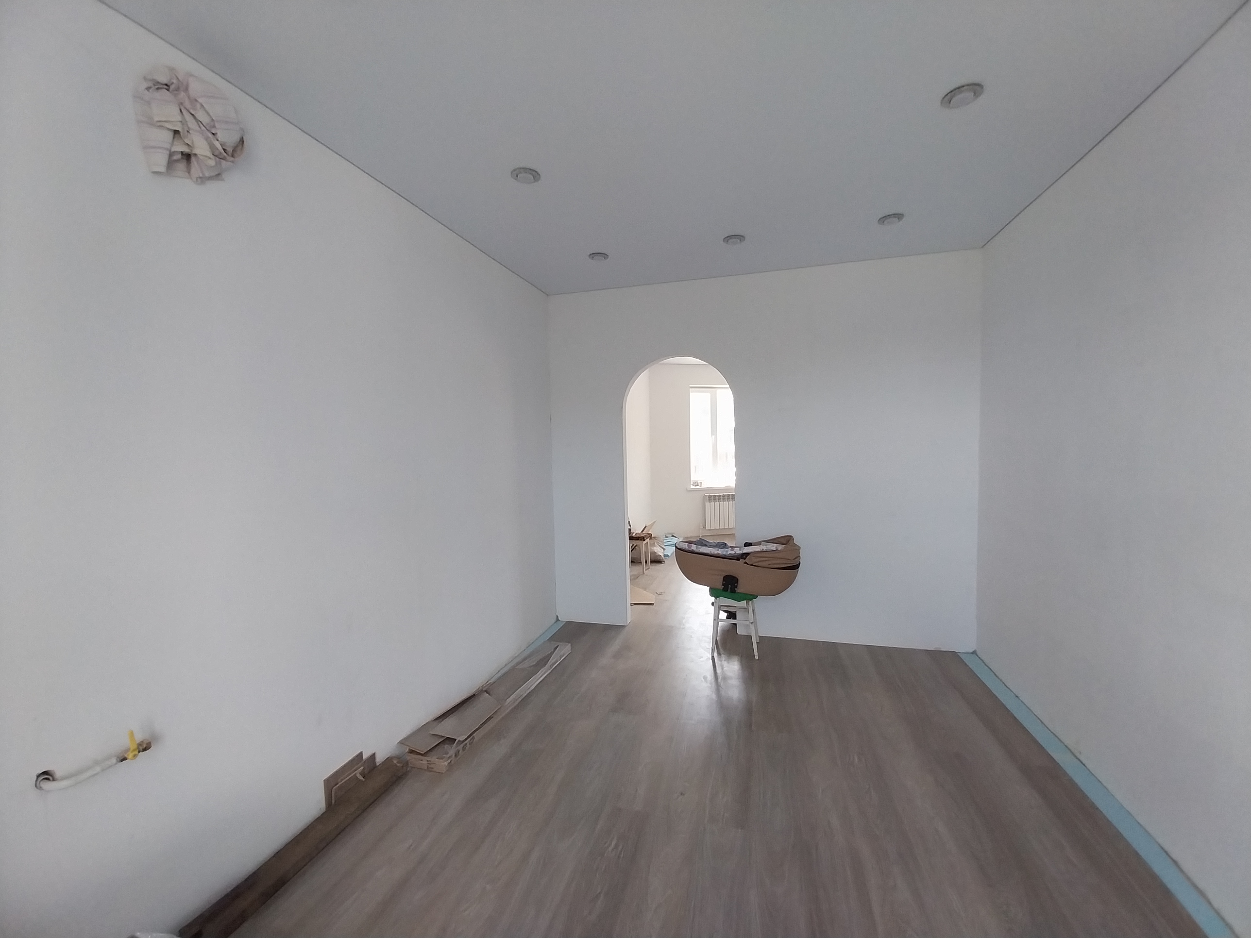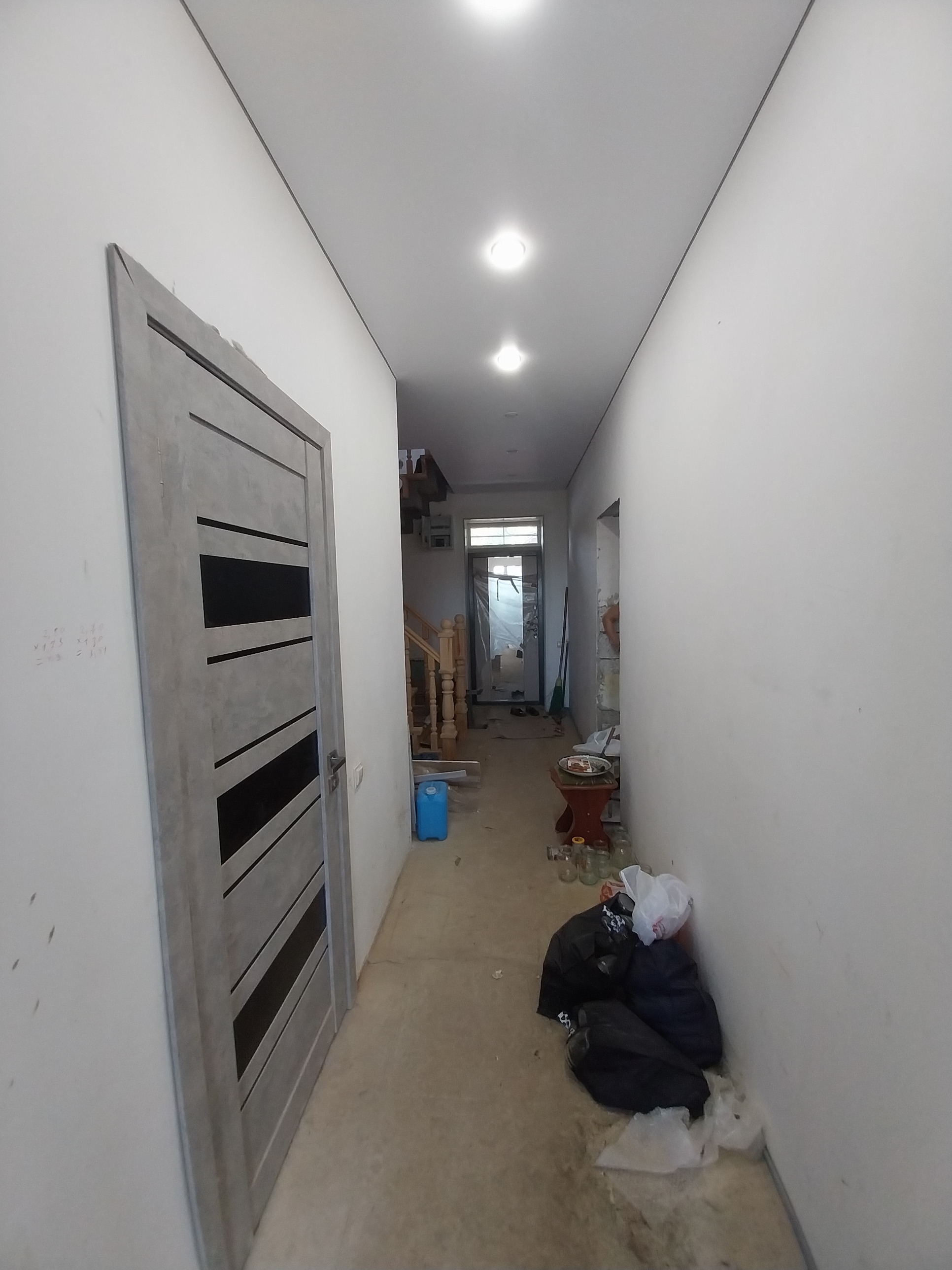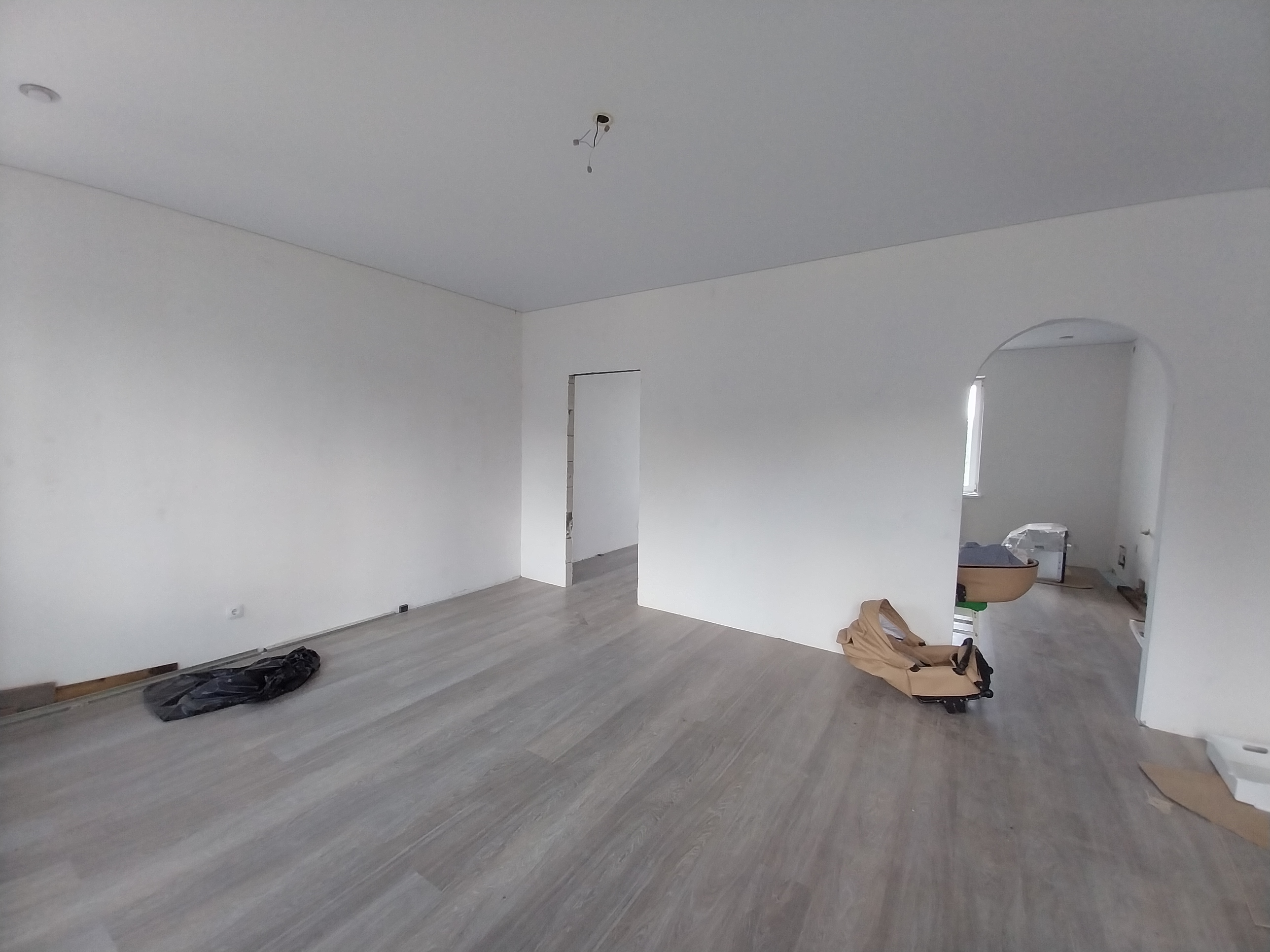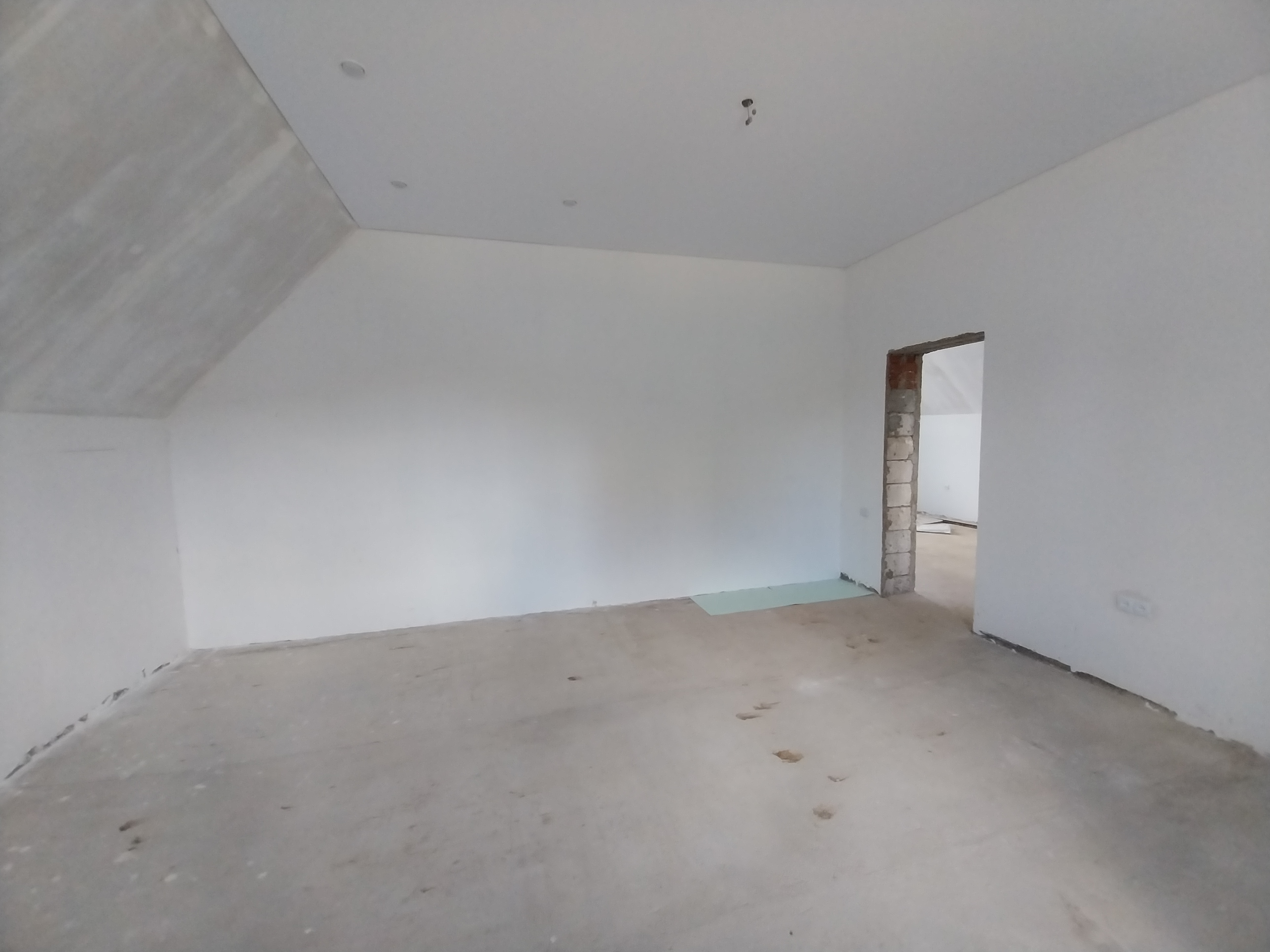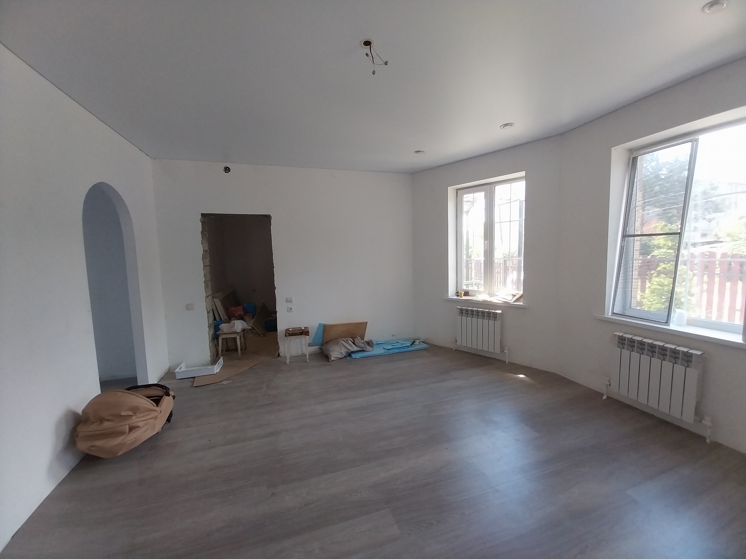 Дом готов к чистовой отделке. На первом этаже на полу ламинат, натяжные потолки во всем доме. Санузел совмещен, в кафеле.