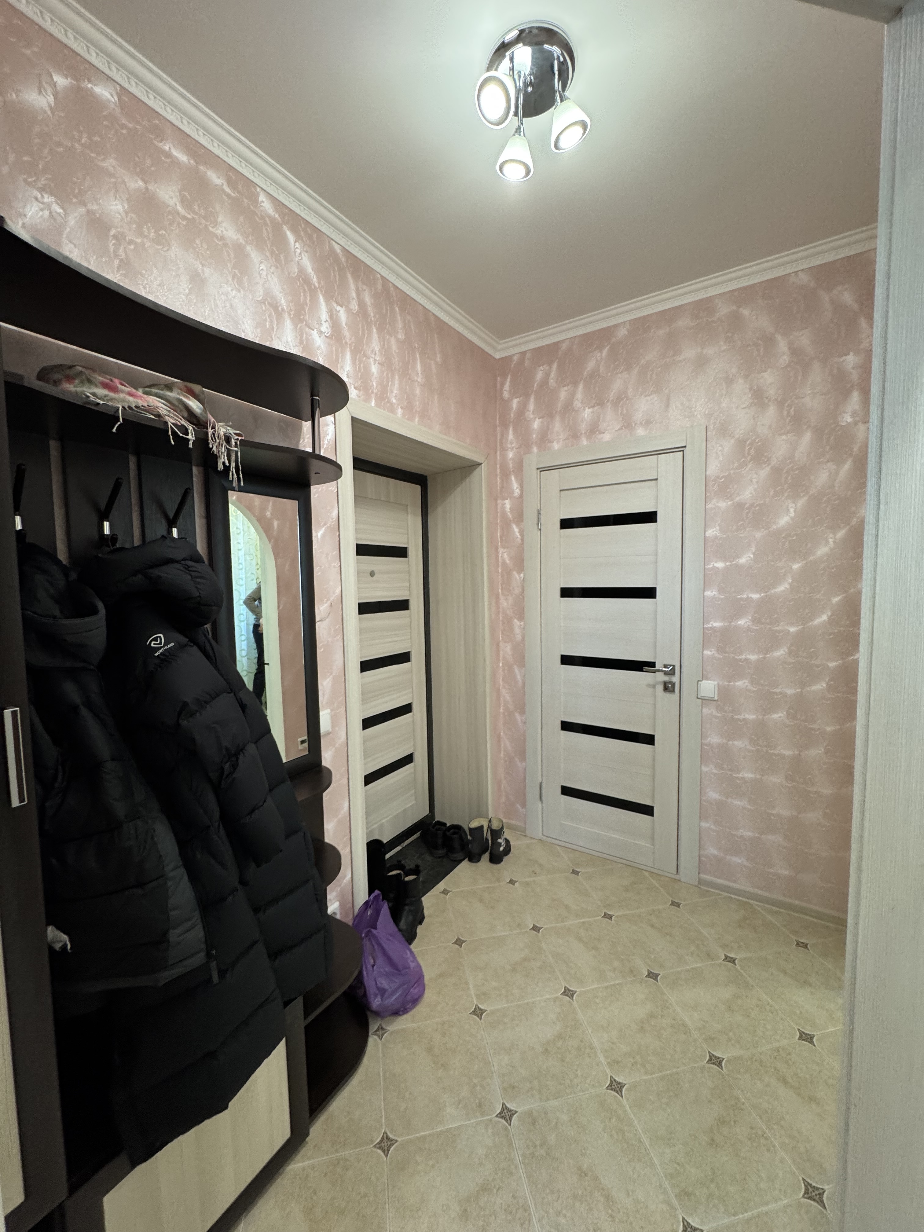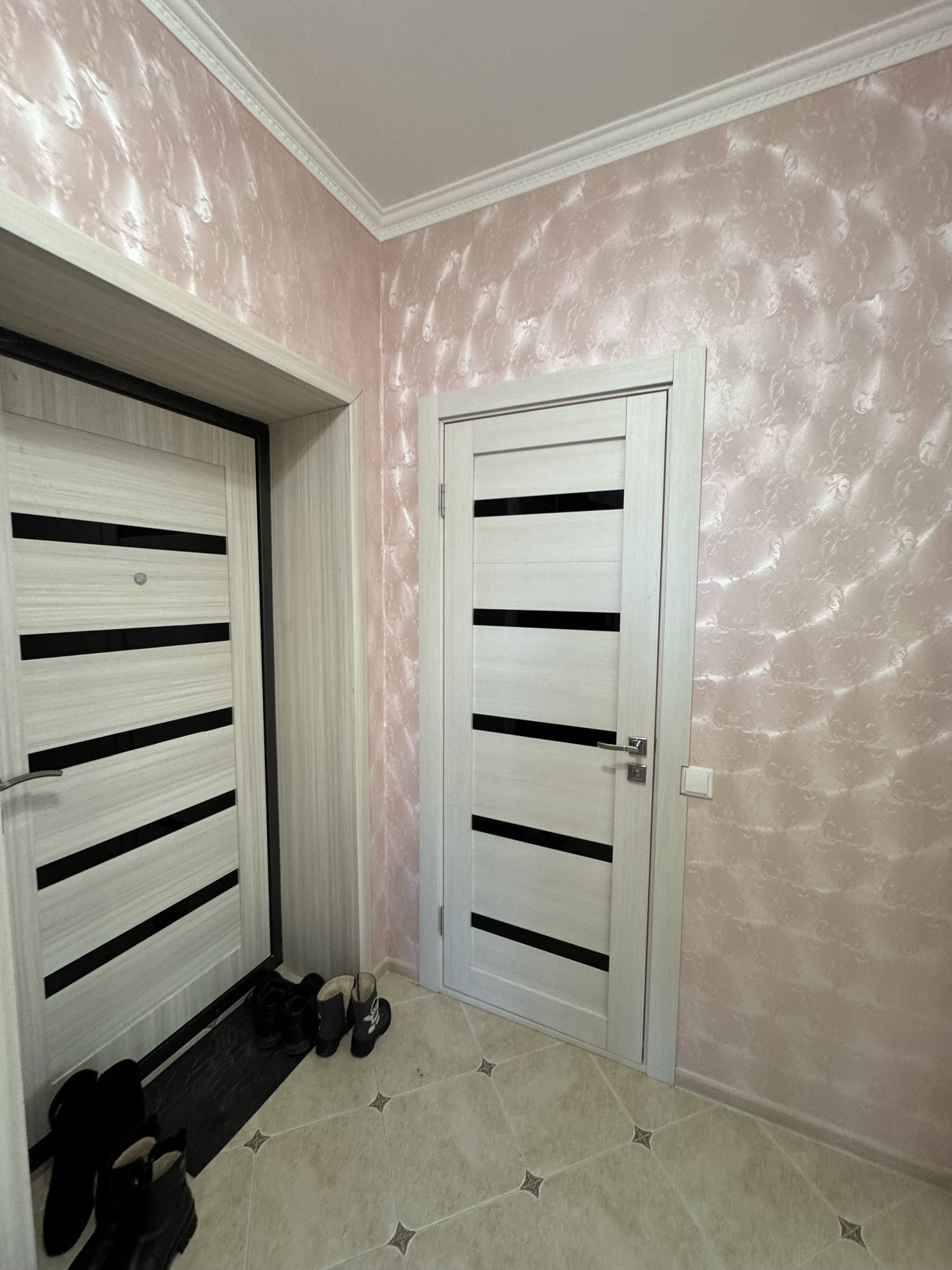 На кухне и в прихожей на полу плитка, установлен теплый пол, хорошие межкомнатные двери
