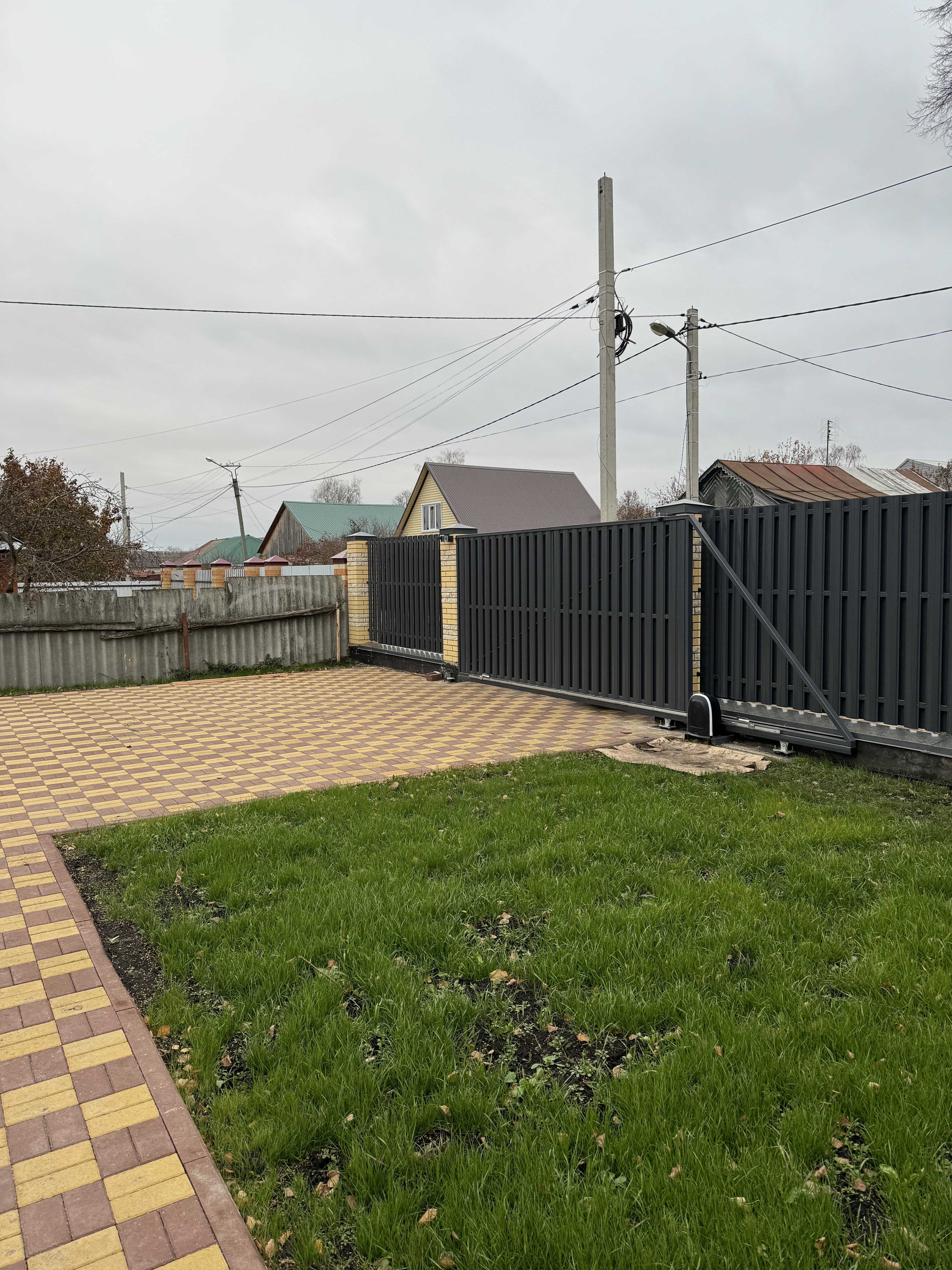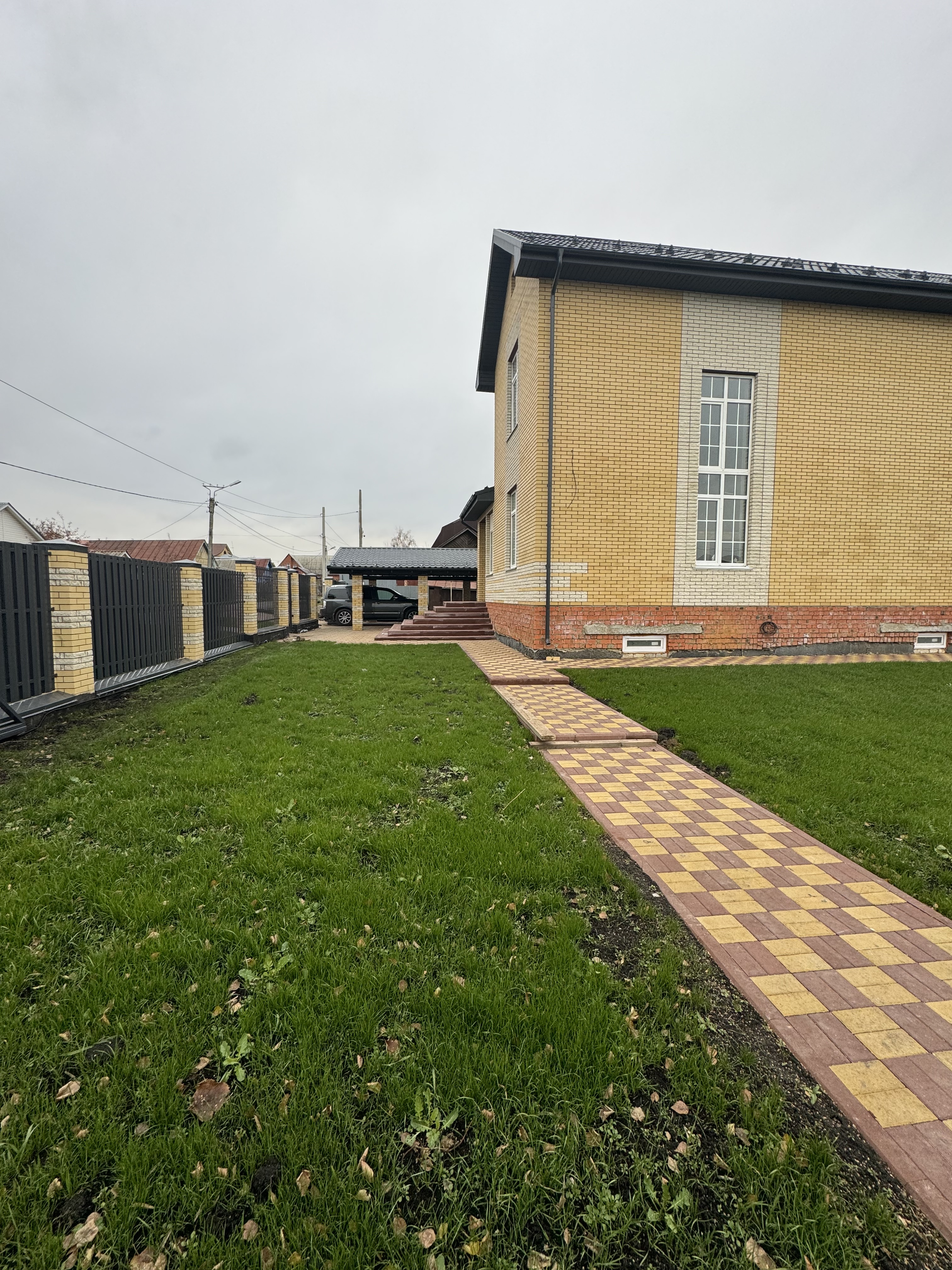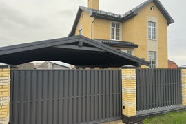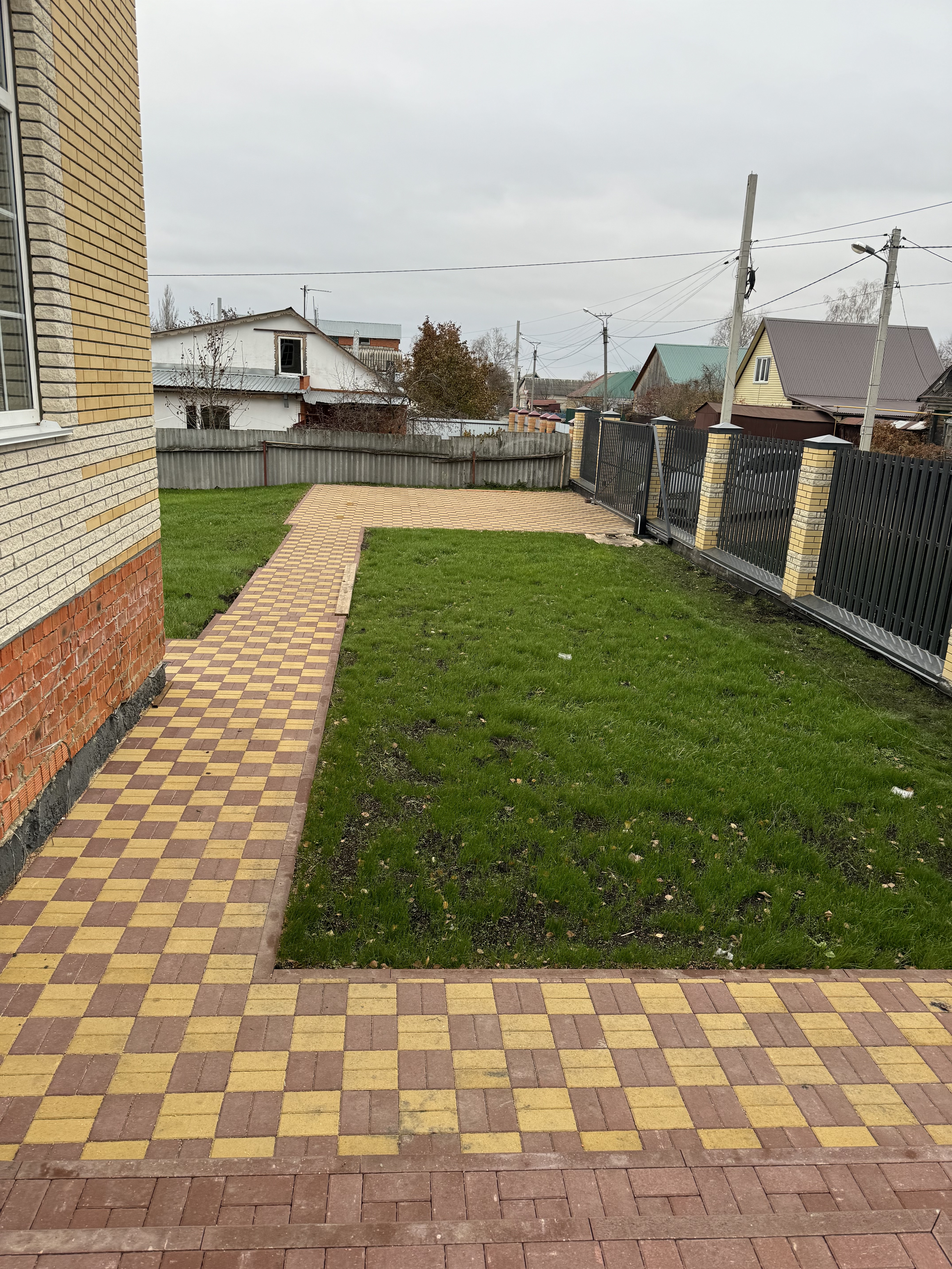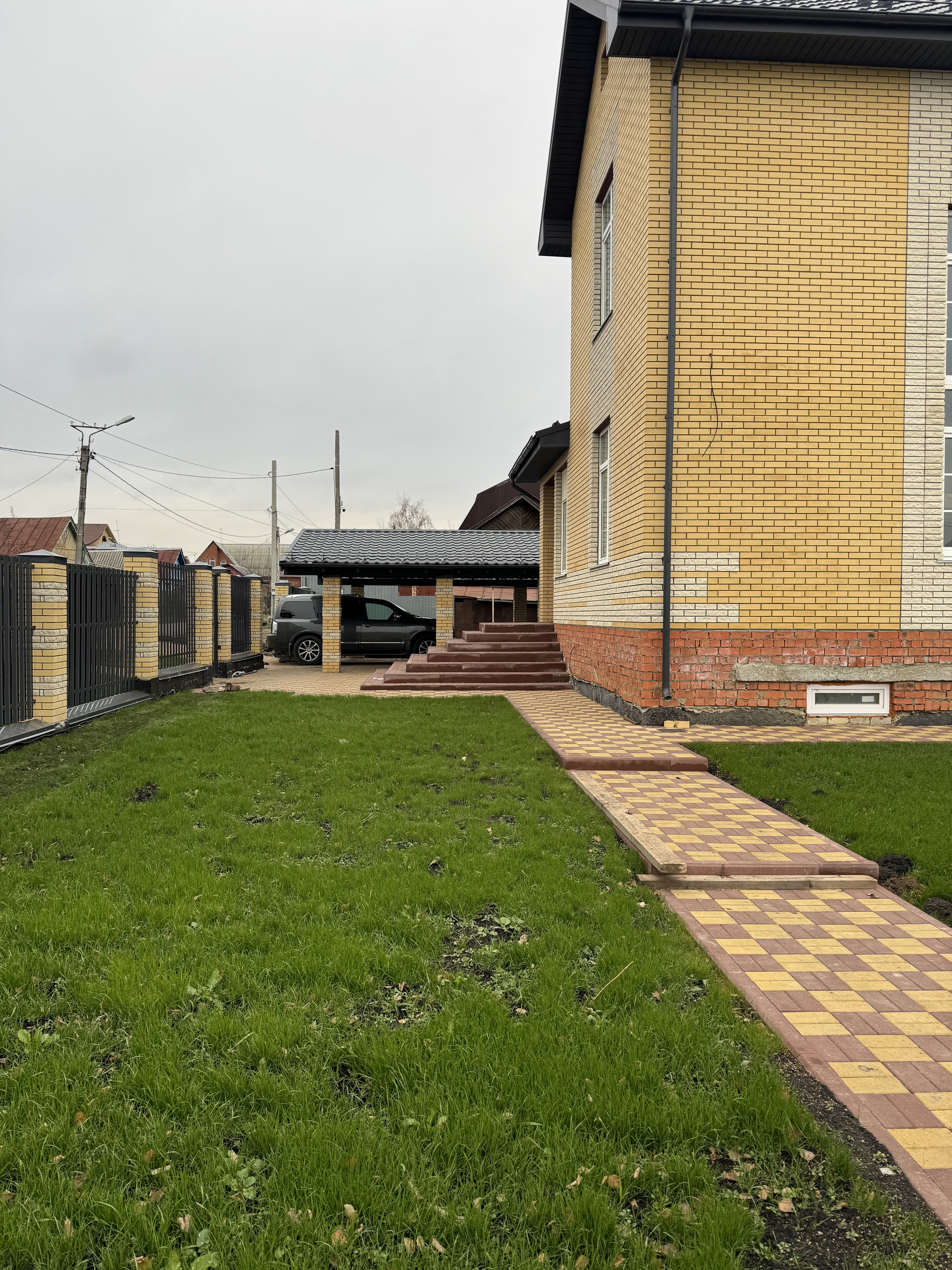 Большой земельный участок с красивым навесом на 4 автомобиля + дополнительно площадка для парковки 2х автомобилей, автоматические ворота, засеян газон, дорожки выложены брусчаткой на всей территории, отдельно выведена ливневая система в отдельный дренажный колодец