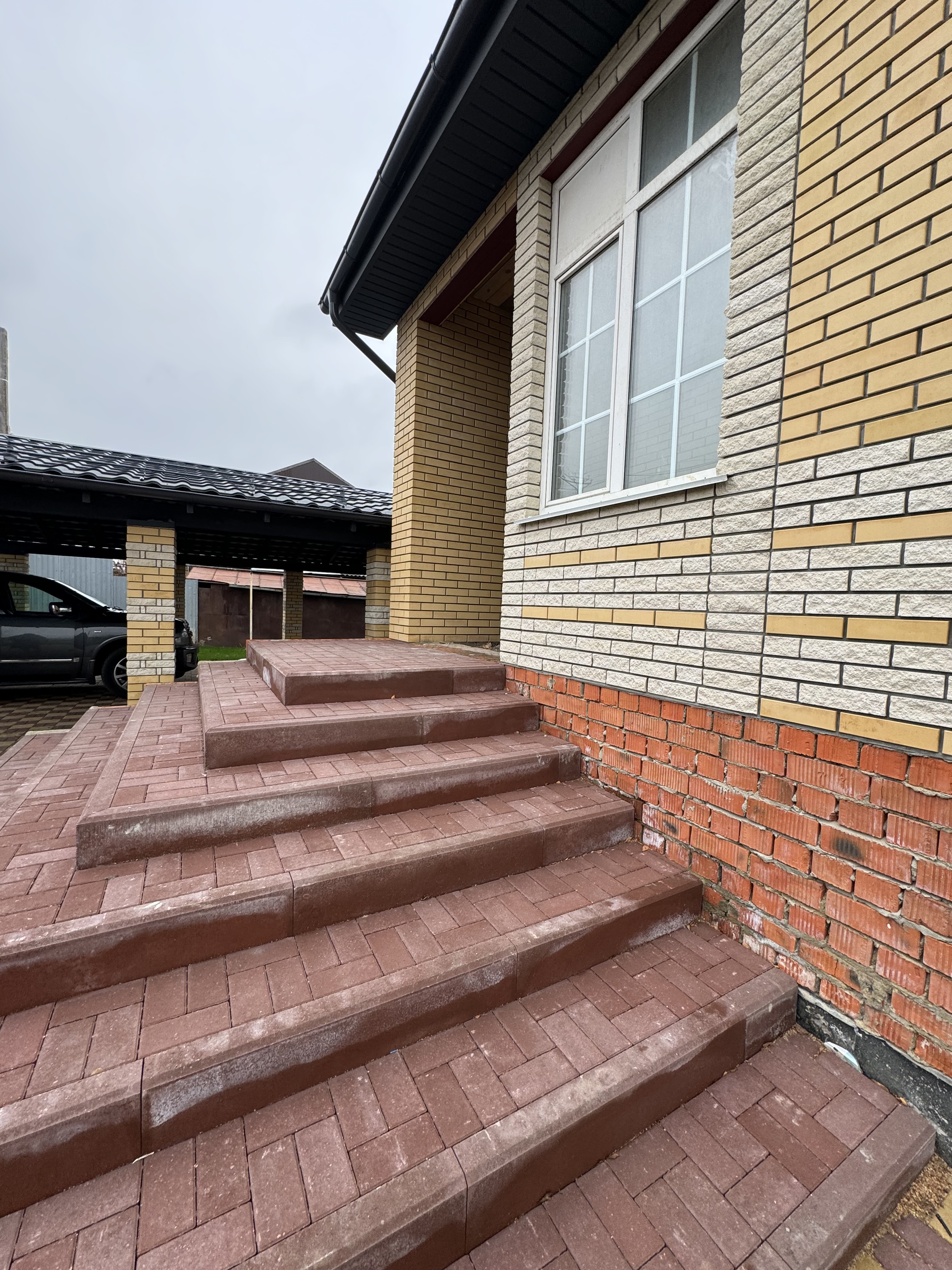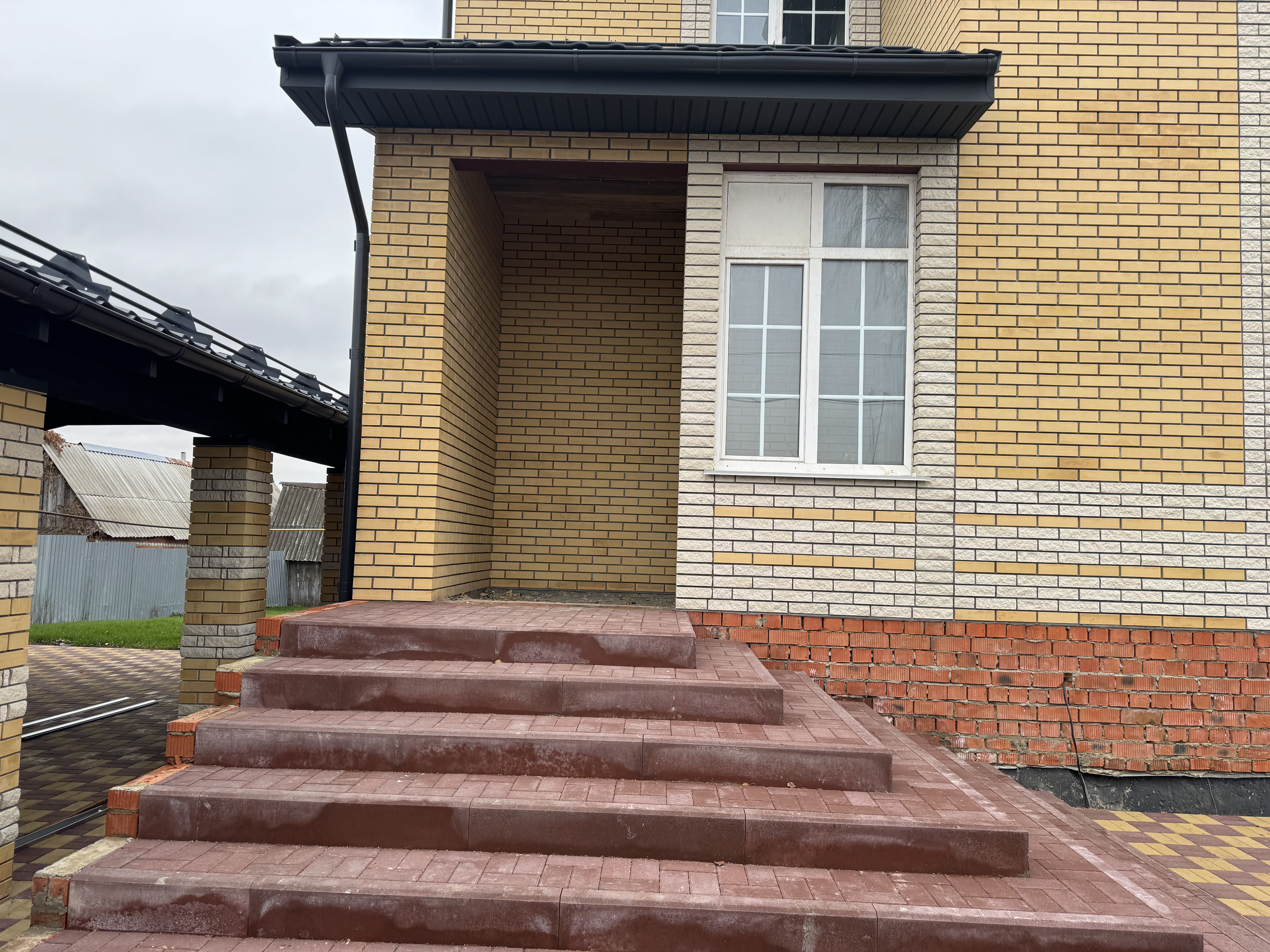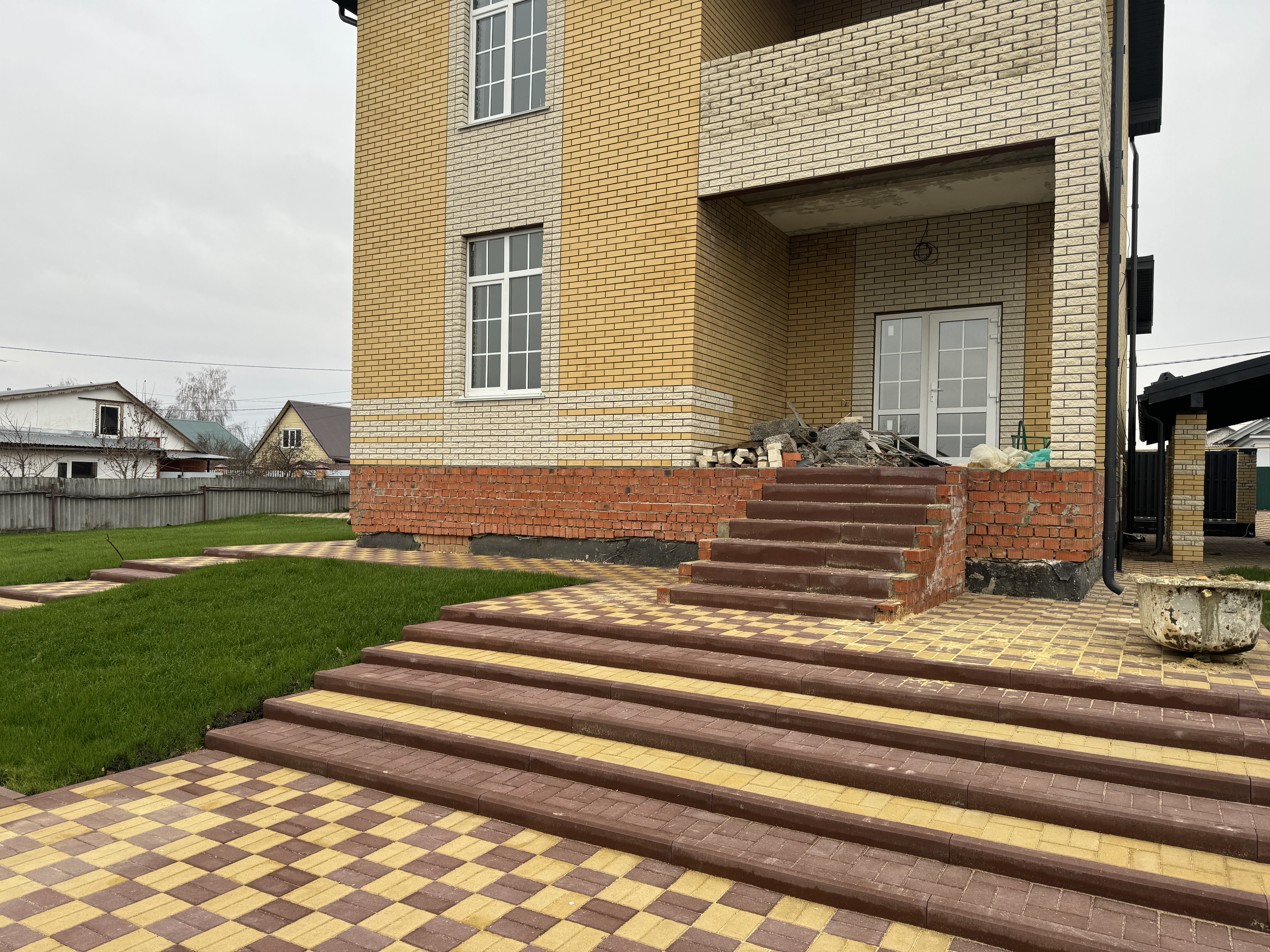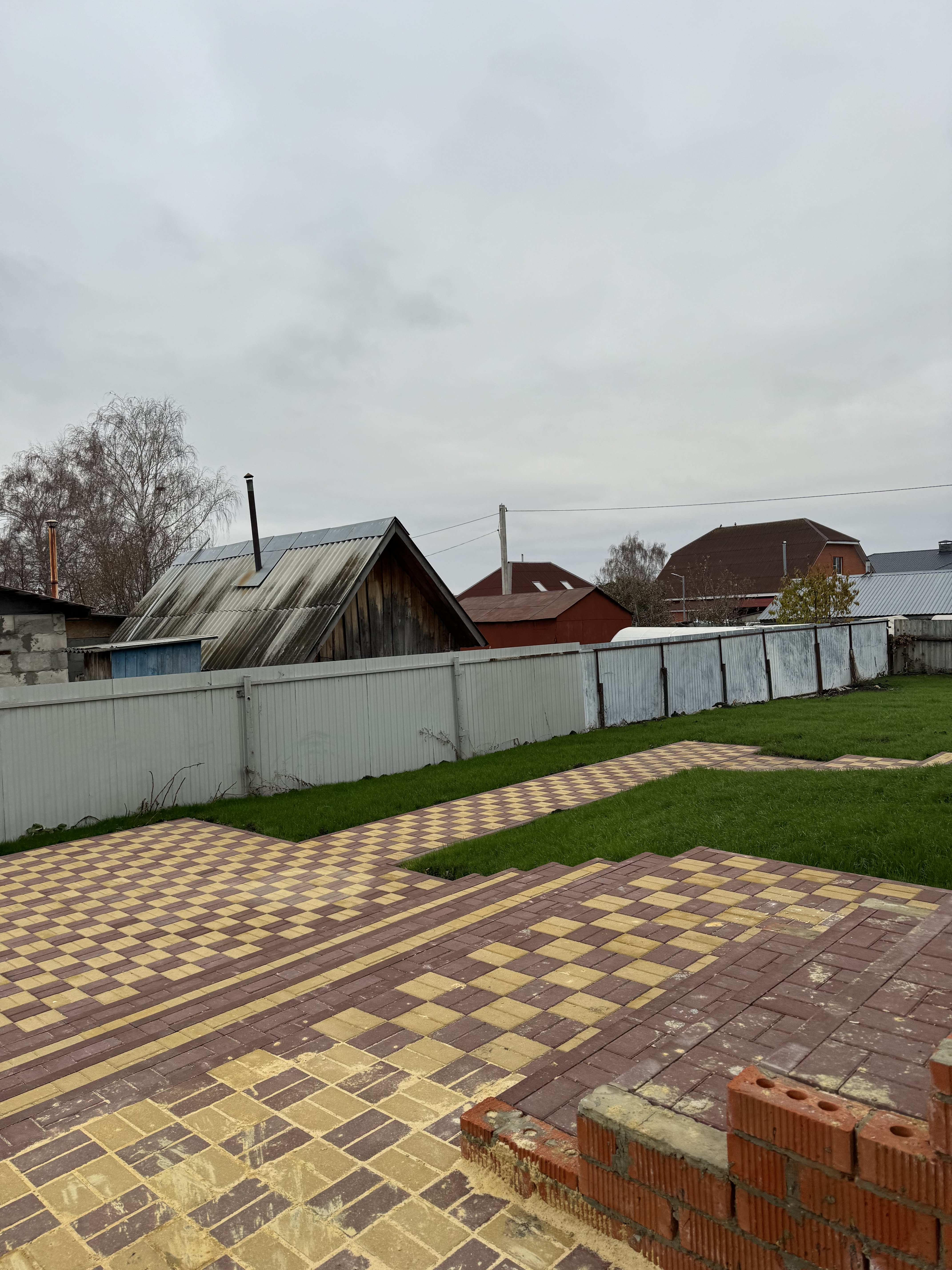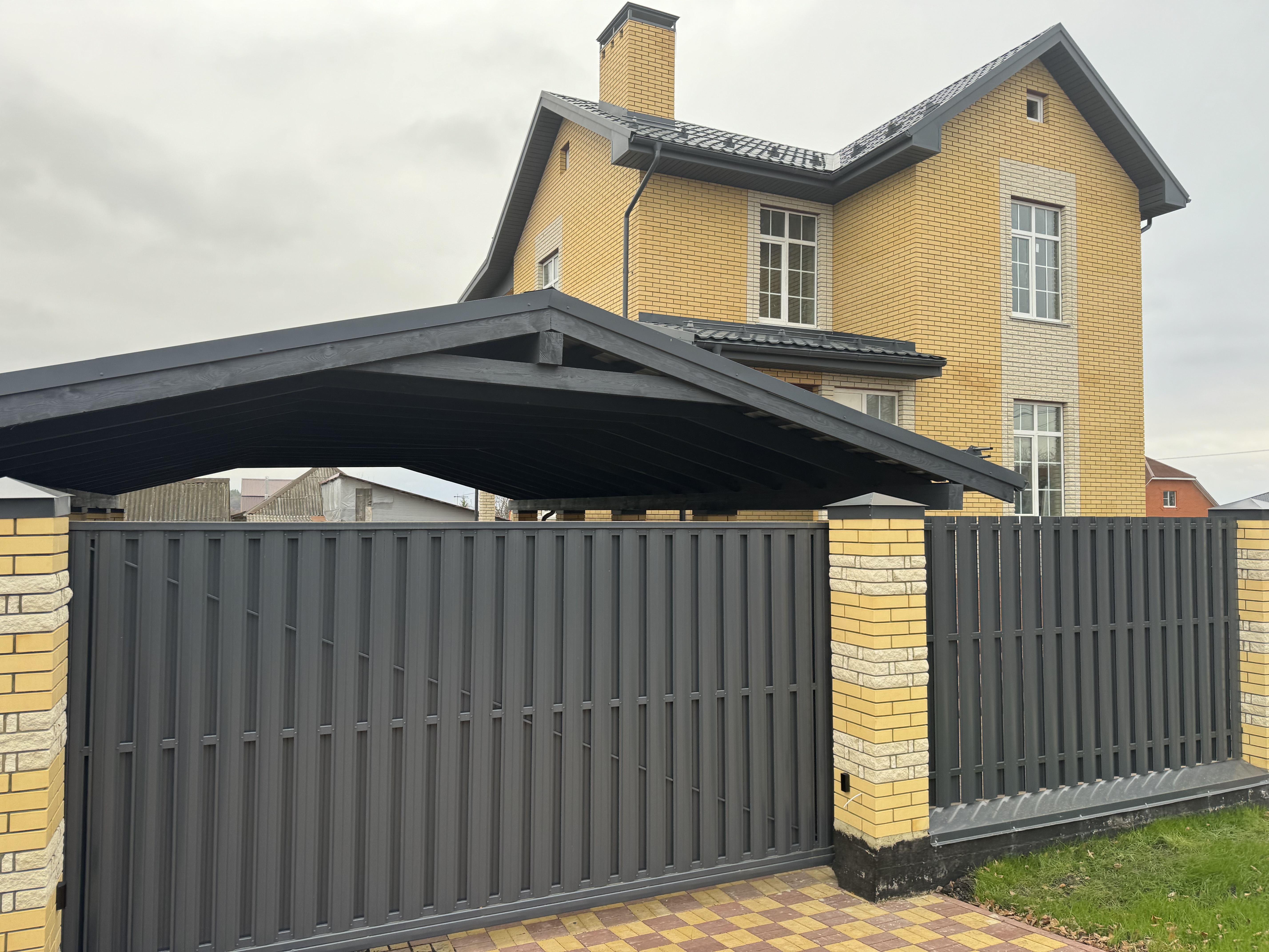 Большой земельный участок с красивым навесом на 4 автомобиля + дополнительно площадка для парковки 2х автомобилей, автоматические ворота, засеян газон, дорожки выложены брусчаткой на всей территории, отдельно выведена ливневая система в отдельный дренажный колодец