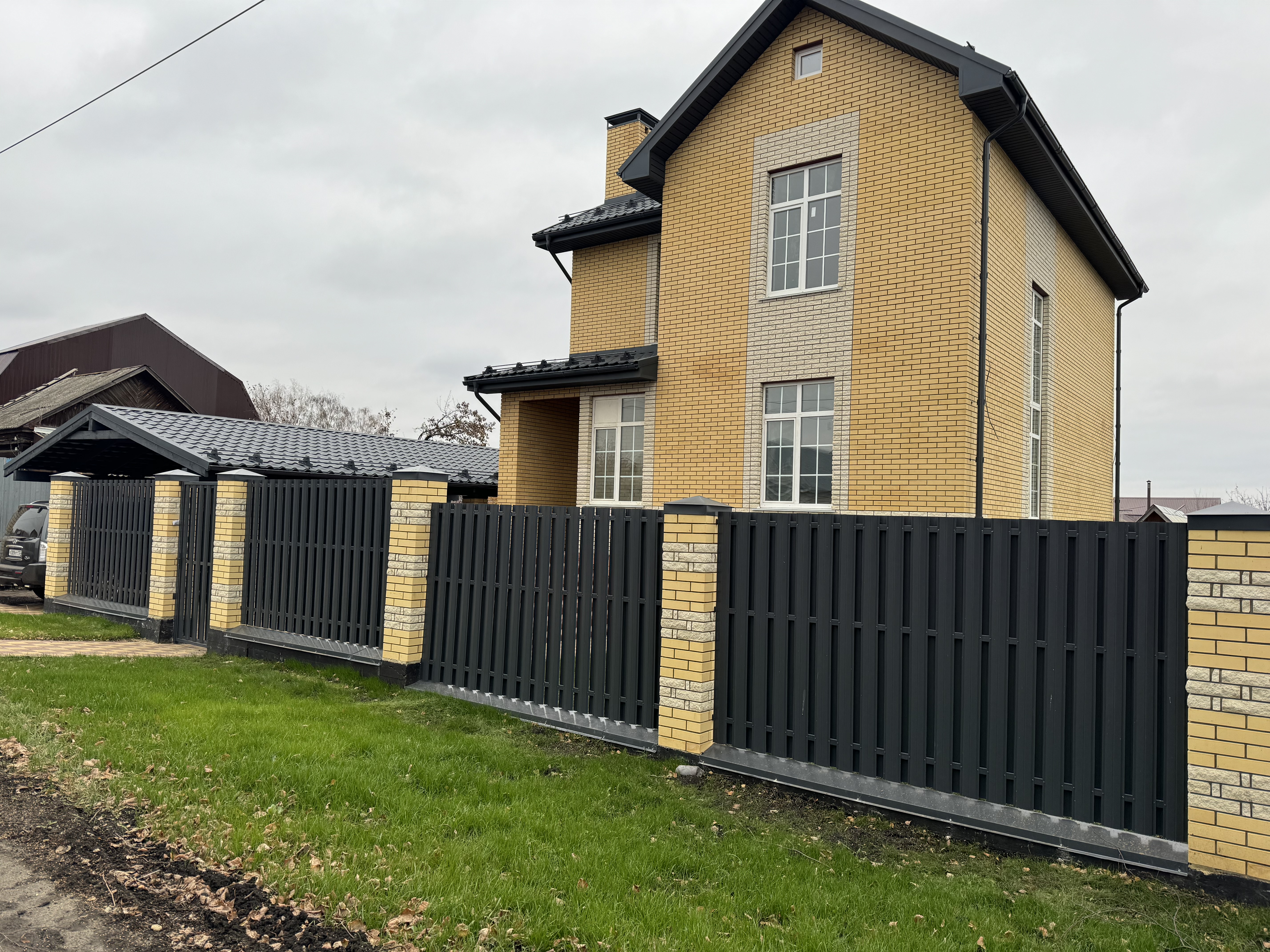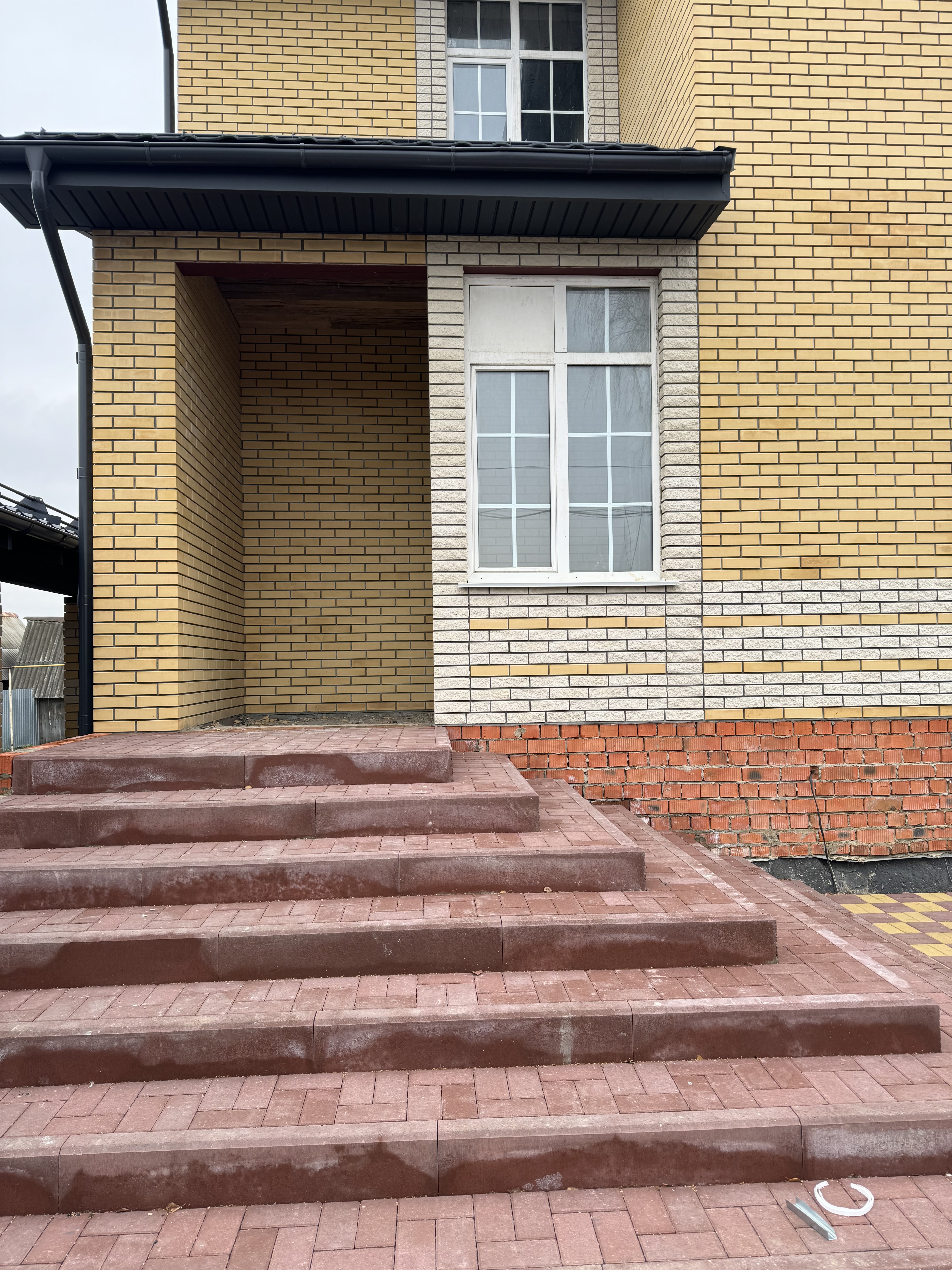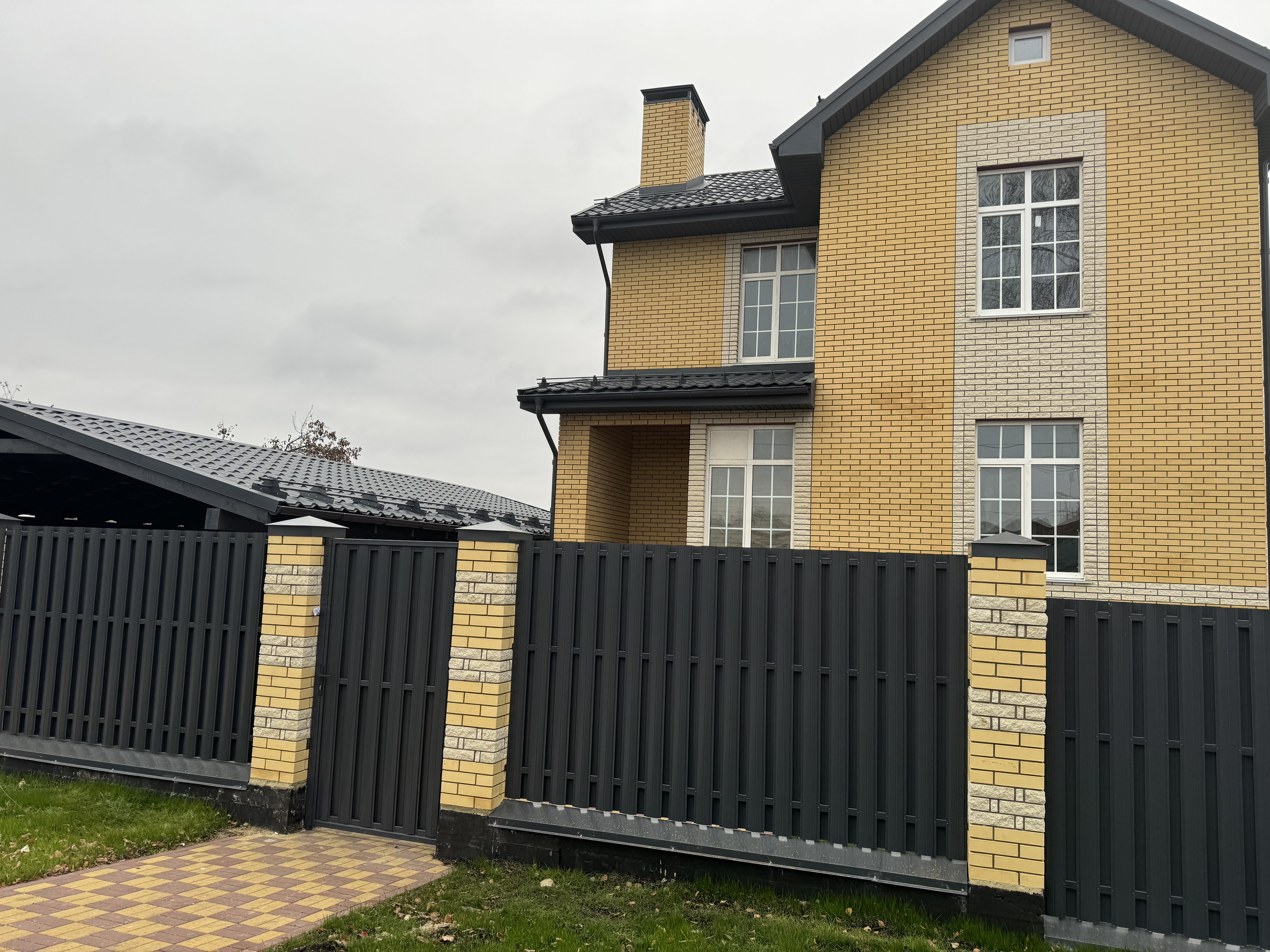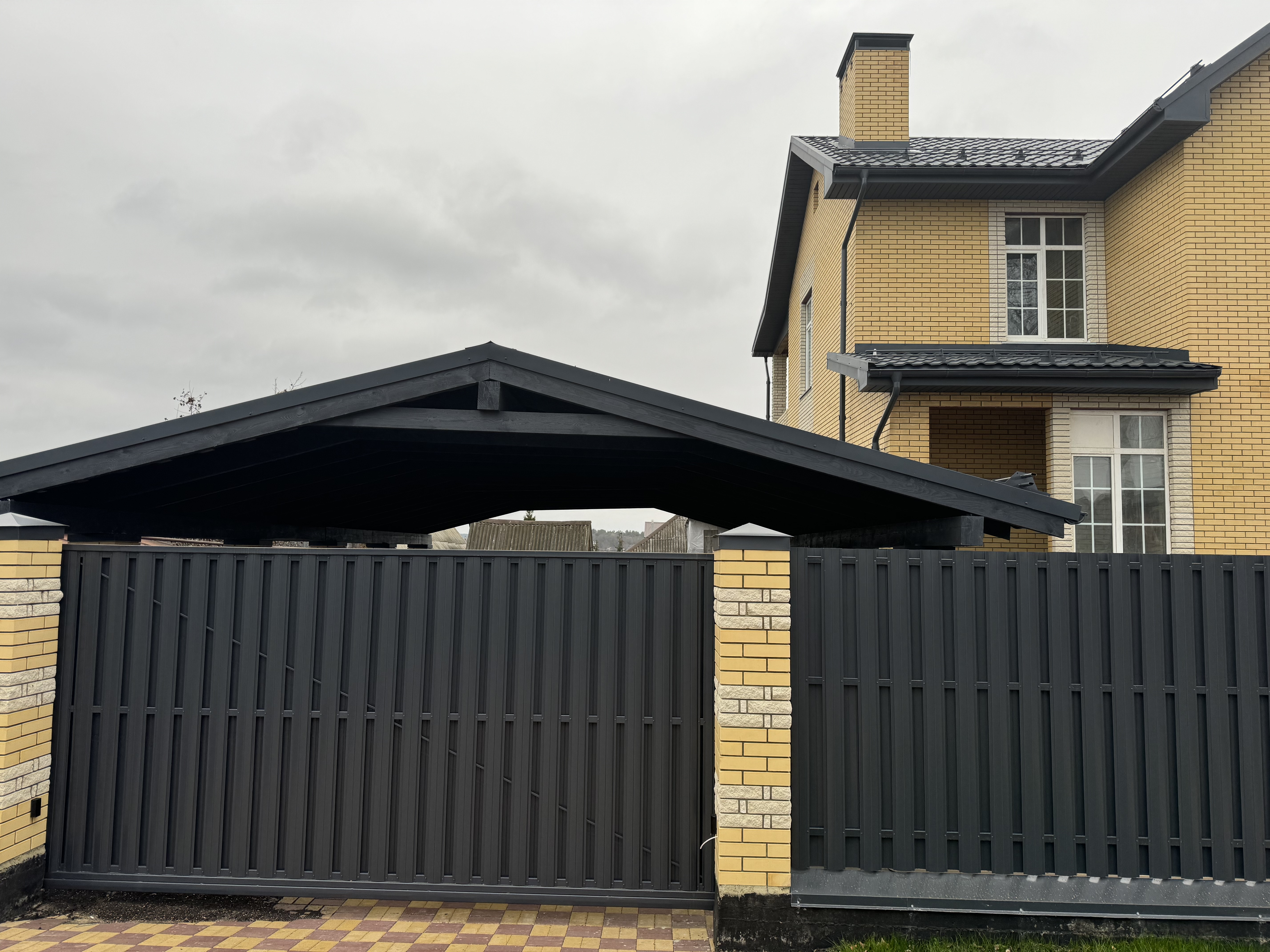 Большой земельный участок с красивым навесом на 4 автомобиля + дополнительно площадка для парковки 2х автомобилей, автоматические ворота, засеян газон, дорожки выложены брусчаткой на всей территории, отдельно выведена ливневая система в отдельный дренажный колодец
