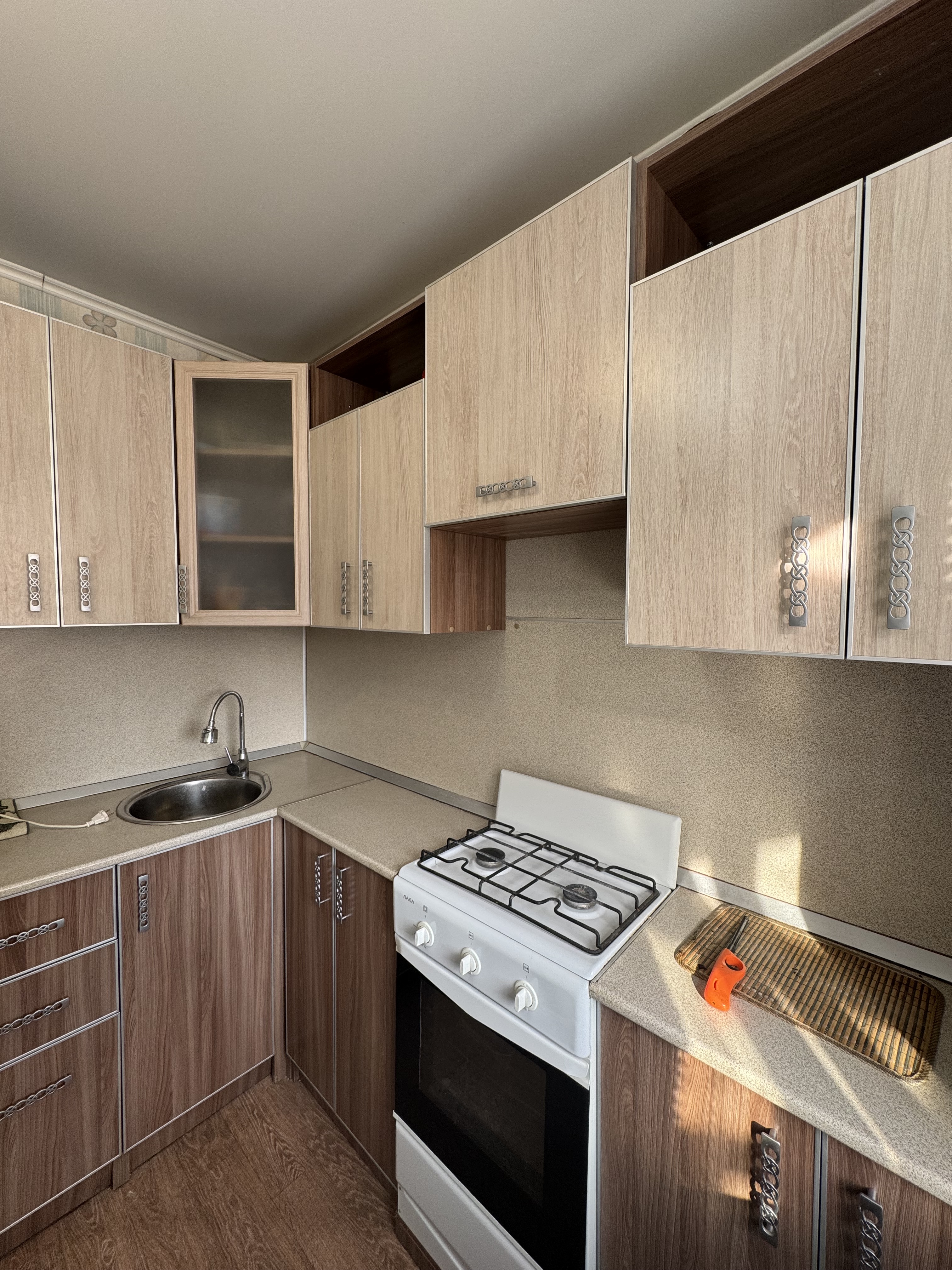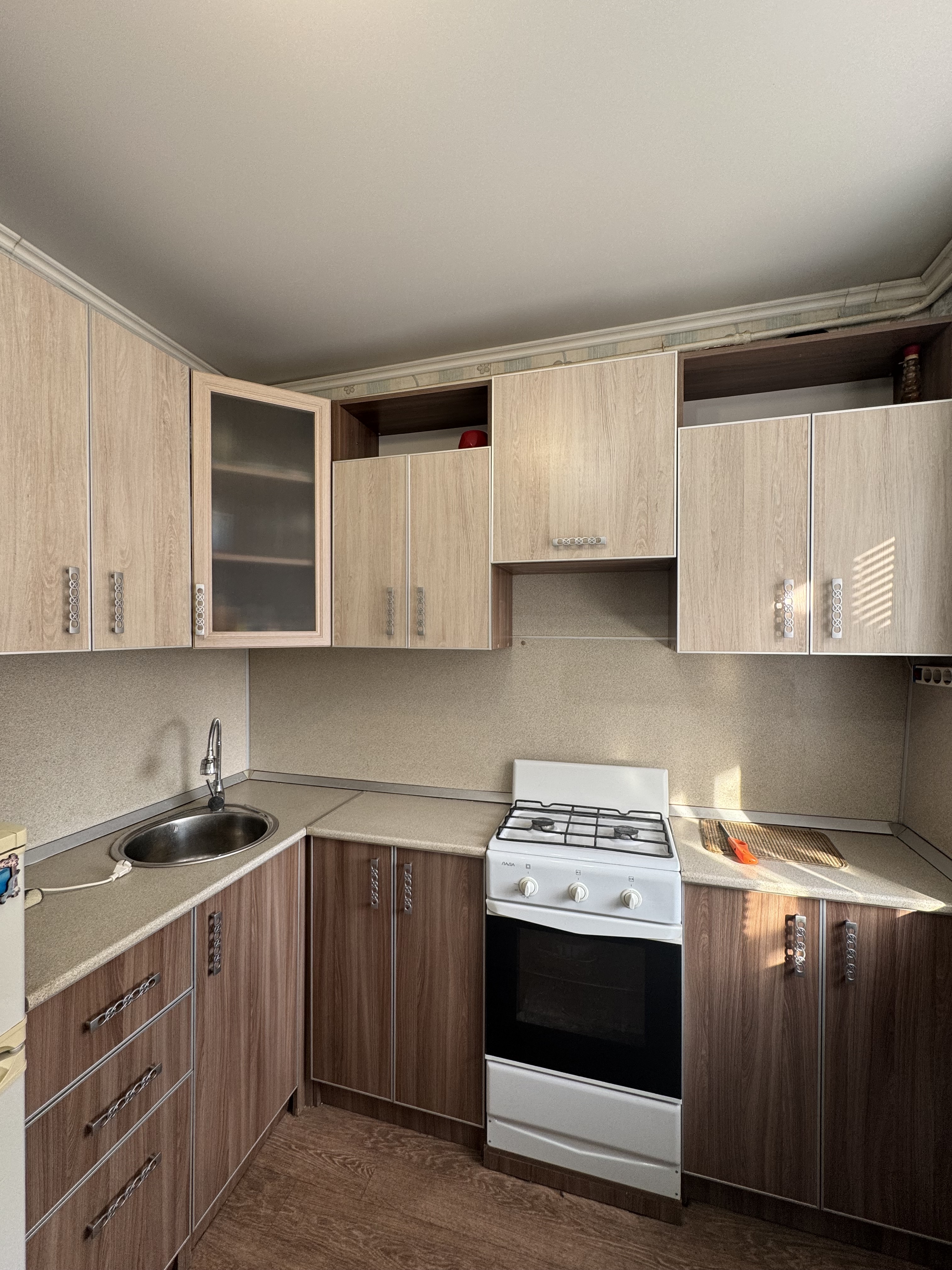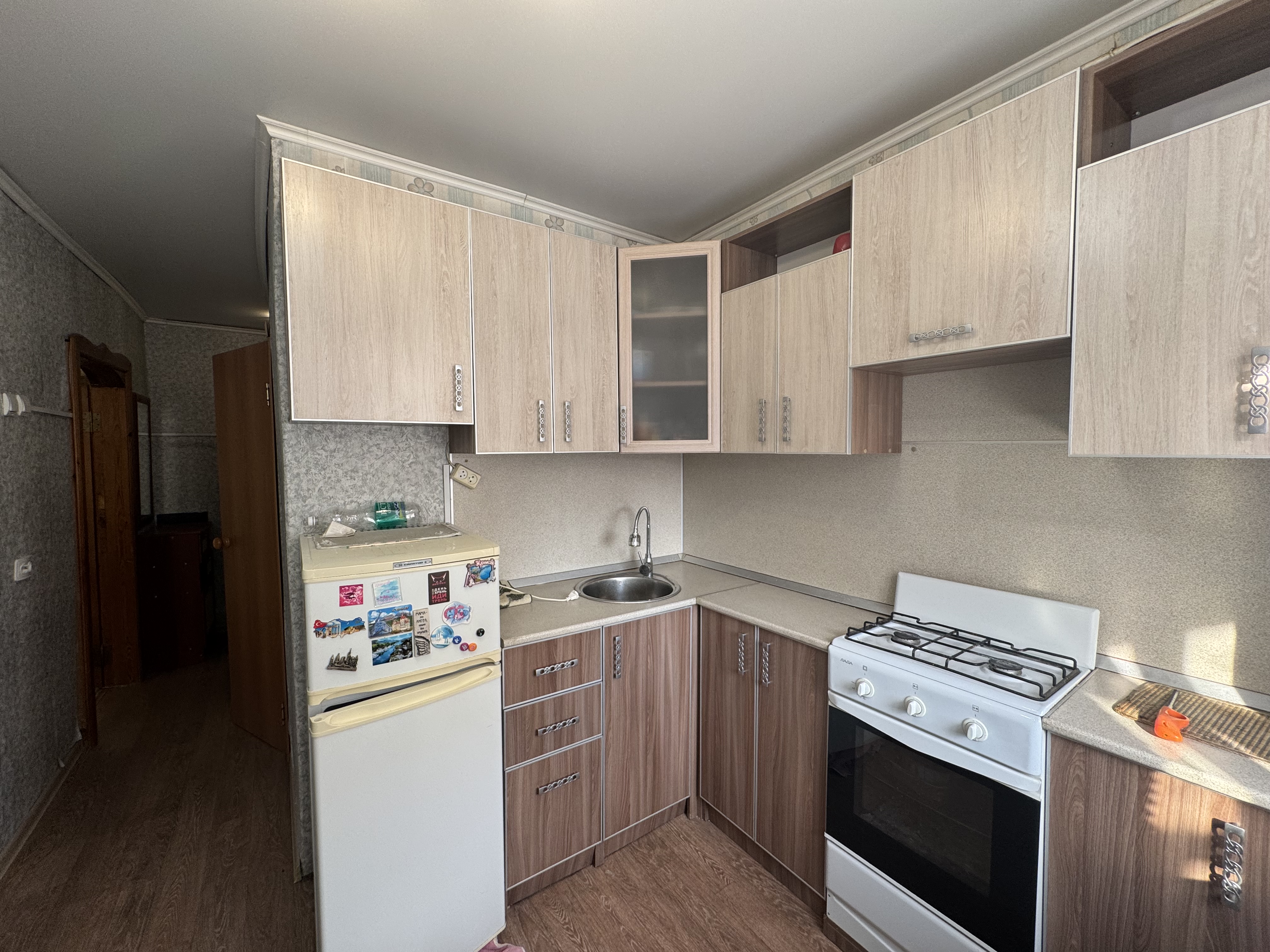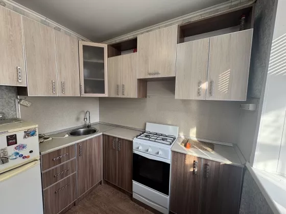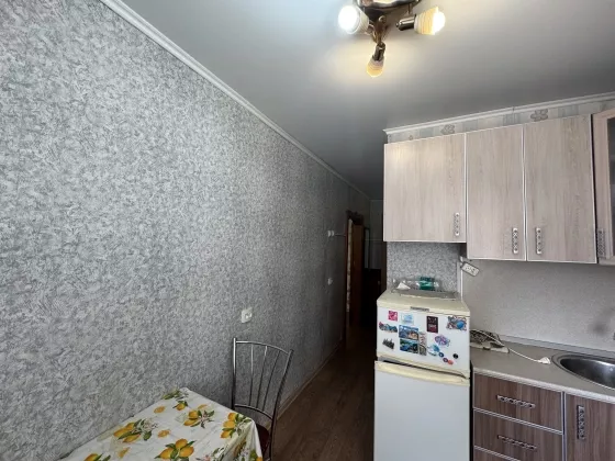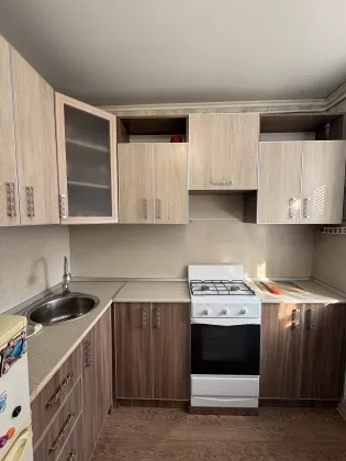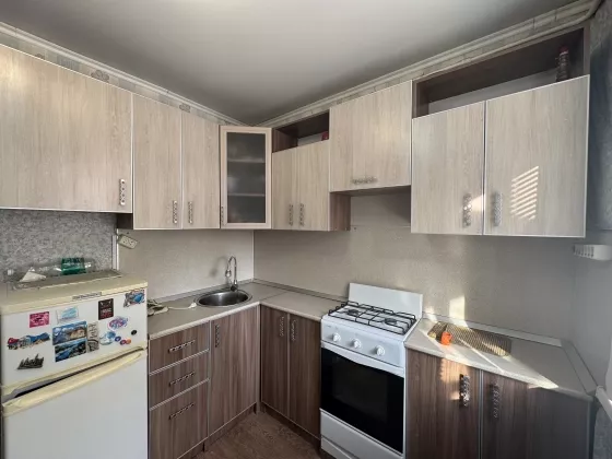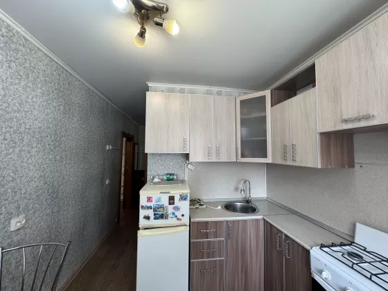 Кухня оборудована современной мебелью и газовой плитой. В комнате установлен вместительный шкаф-купе. Санузел совмещенный, выполнен в светлых тонах.Во дворе обустроена детская площадка и открытая парковка. Газоснабжение обеспечивает удобство приготовления пищи. Дом без лифта, но это компенсируется удобным расположением и хорошей транспортной доступностью.